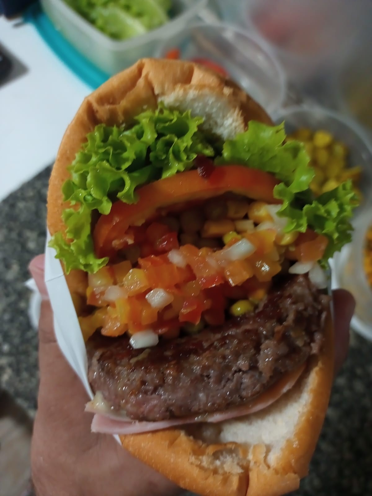 Pão, Hambúrguer, Queijo, Presunto, Alface, Tomate, Pepino, Milho, Ervilha, Vinagrete