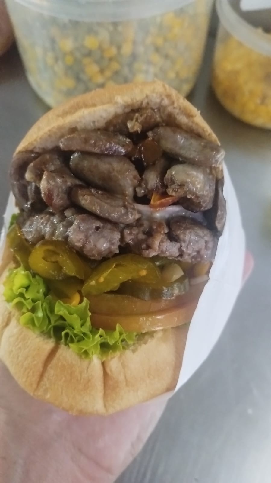 Pão, Hambúrguer, Queijo, Presunto, Coração, Alface, Tomate, Pepino, Milho, Ervilha, Vinagrete